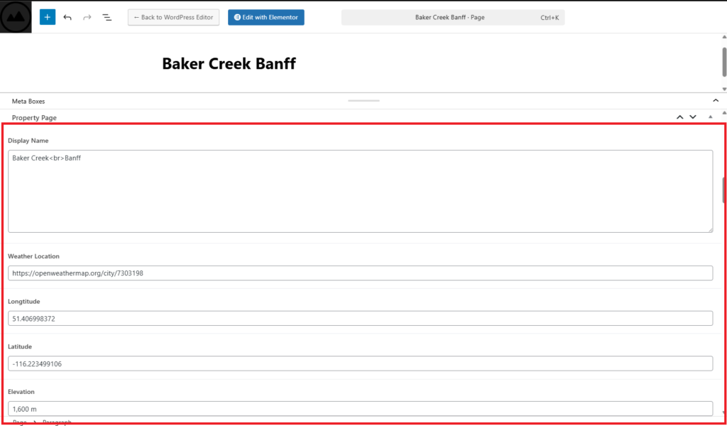 You will see a section containing ACF fields used to control the property page content.
